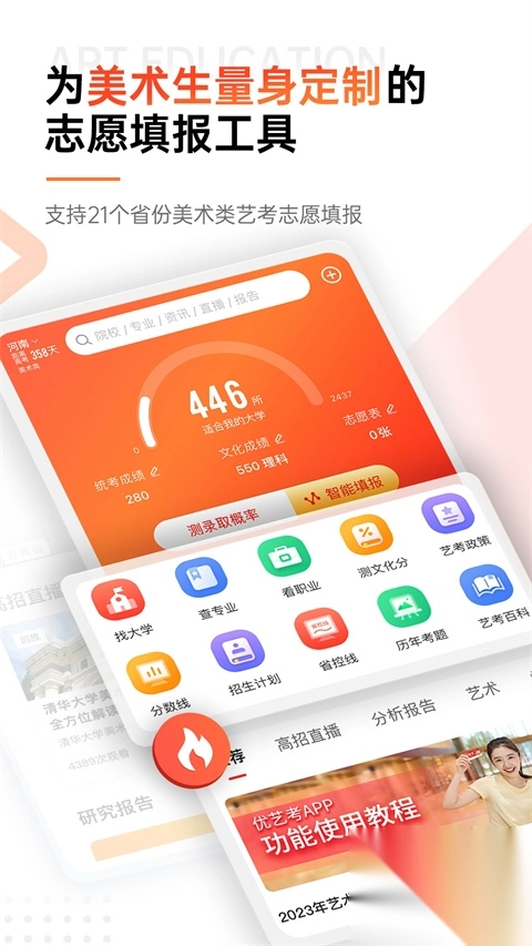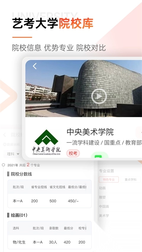 覆盖全国各大艺术类高校和艺术类专业,查分数、查专业、查院校一站式服务,快速找到院校介绍和招生简章;