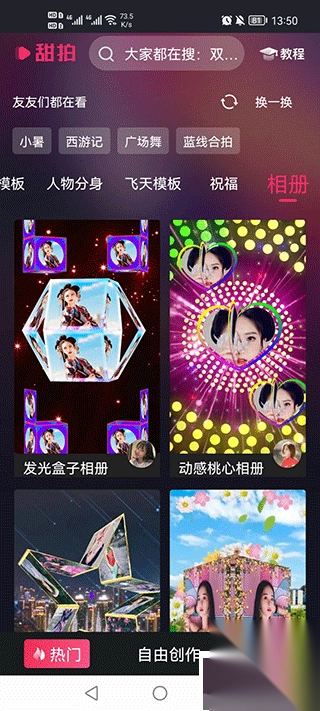 甜拍app,一款操作简便的视频制作软件。它具备超有趣的视频特效、节日模板,还有精美且富有创意的3D视频以及相册影集等功能。这款软件极易上手,一用就会,能助力用户轻松开启视频制作之旅。不仅如此,软件内配备完整教程,用户无需在网上四处寻觅辅助教程,一键就能生成创意视频,简直方便至极。喜欢的朋友,赶紧下载体验一番吧!