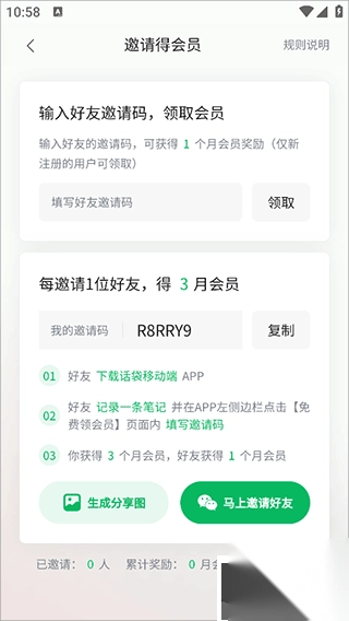 老用户依次点击「我的」→「邀请得会员」→「马上邀请」,即可生成唯一邀请码、宣发海报以及文案。
