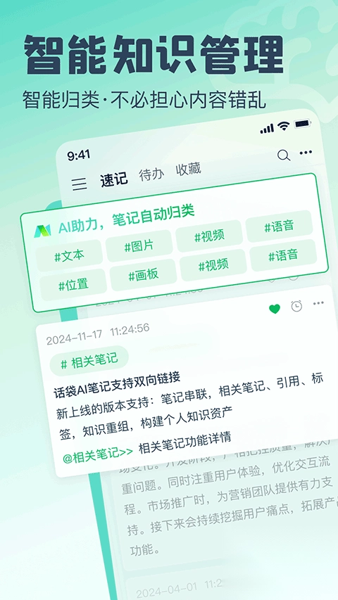 话袋APP,由上海妙画信息科技有限公司精心研发,是一款全新的智能卡片式笔记工具。该应用融合了即时记录、跨平台同步、内容收藏、笔记关联等诸多实用功能。借助话袋APP,用户能在碎片化时间里迅速记录各种信息,还能把小红书、微博、微信公众号等社交平台上的文章、视频、图片链接,直接保存到笔记当中。此外,话袋APP达成了手机客户端、PC端、网页版以及浏览器插件的全平台数据同步,确保用户重要的笔记内容,无论何时何地,都能轻松获取、便捷查阅。