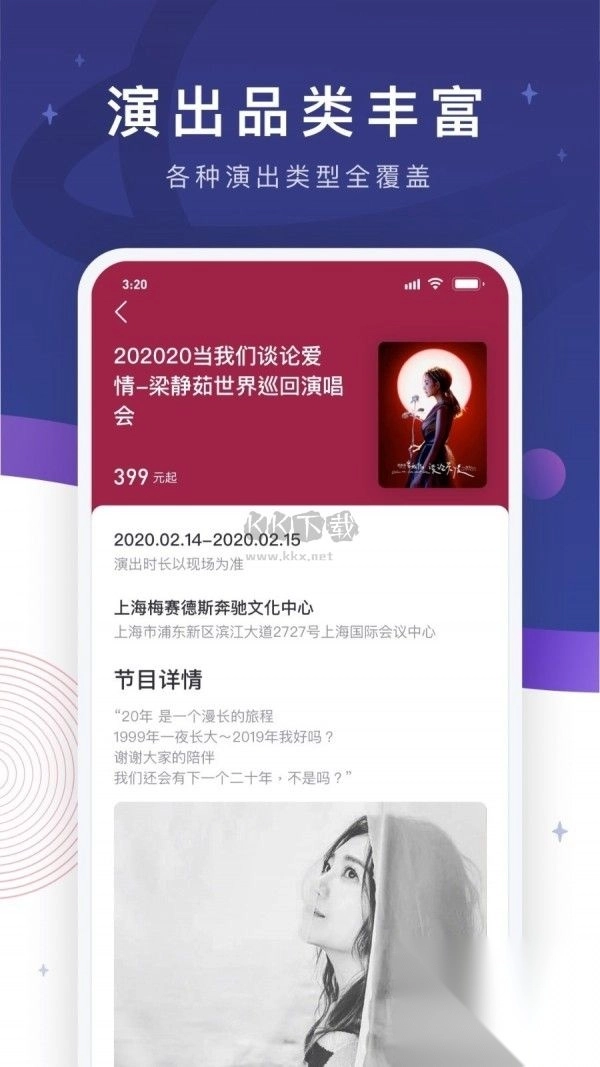 我们提供:你喜欢的演唱会、音乐节、脱口秀、舞台表演、体育比赛、展览等等的门票,我们努力让买票变得更快乐。