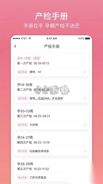 支持产检手册查阅,可看到所有不同怀孕时段需要检查的重点
