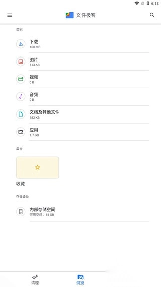 2、浏览界面可以查看图片、视频、音频、文档、应用,还有下载的文件,合集,内部存储空间。