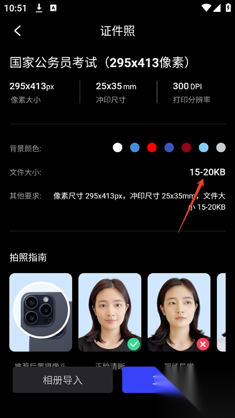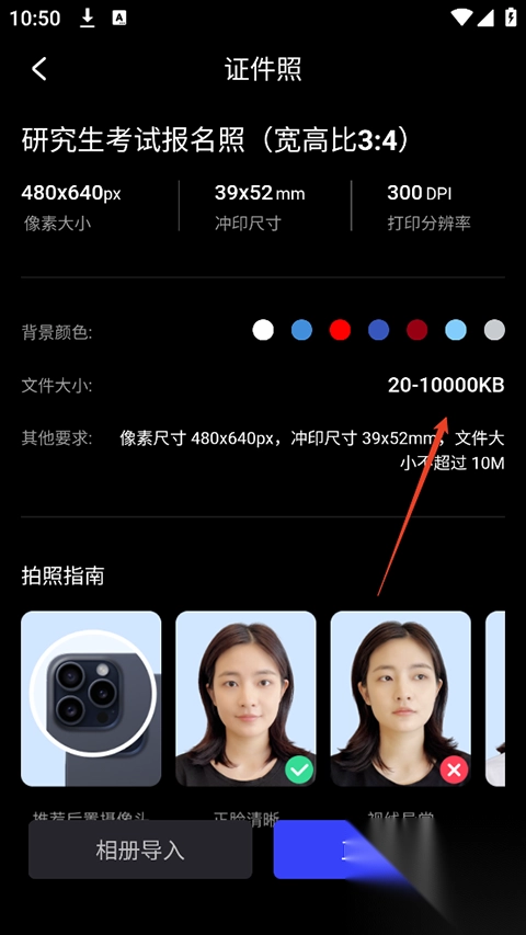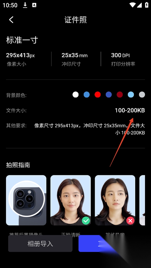 照片大小能够通过更换照片类型来调整,例如一寸寸照的照片大小最大为200kb 。