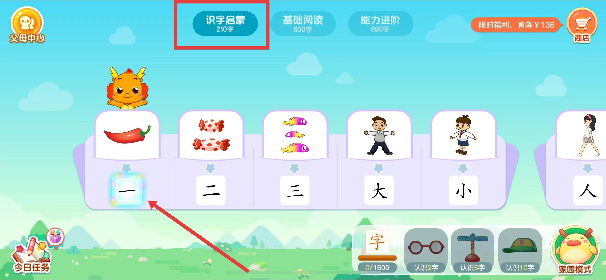 1、进入【识字启蒙】板块,点击带有辣椒图案的【一】字卡片开启学习。
