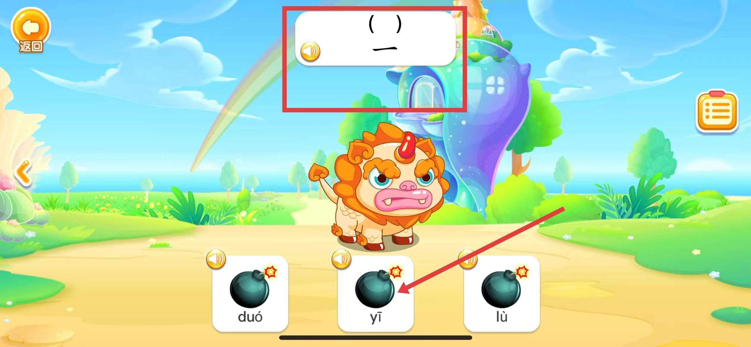 4、根据上方提示,点击标有【yī】读音的炸弹图标,完成读音匹配任务。