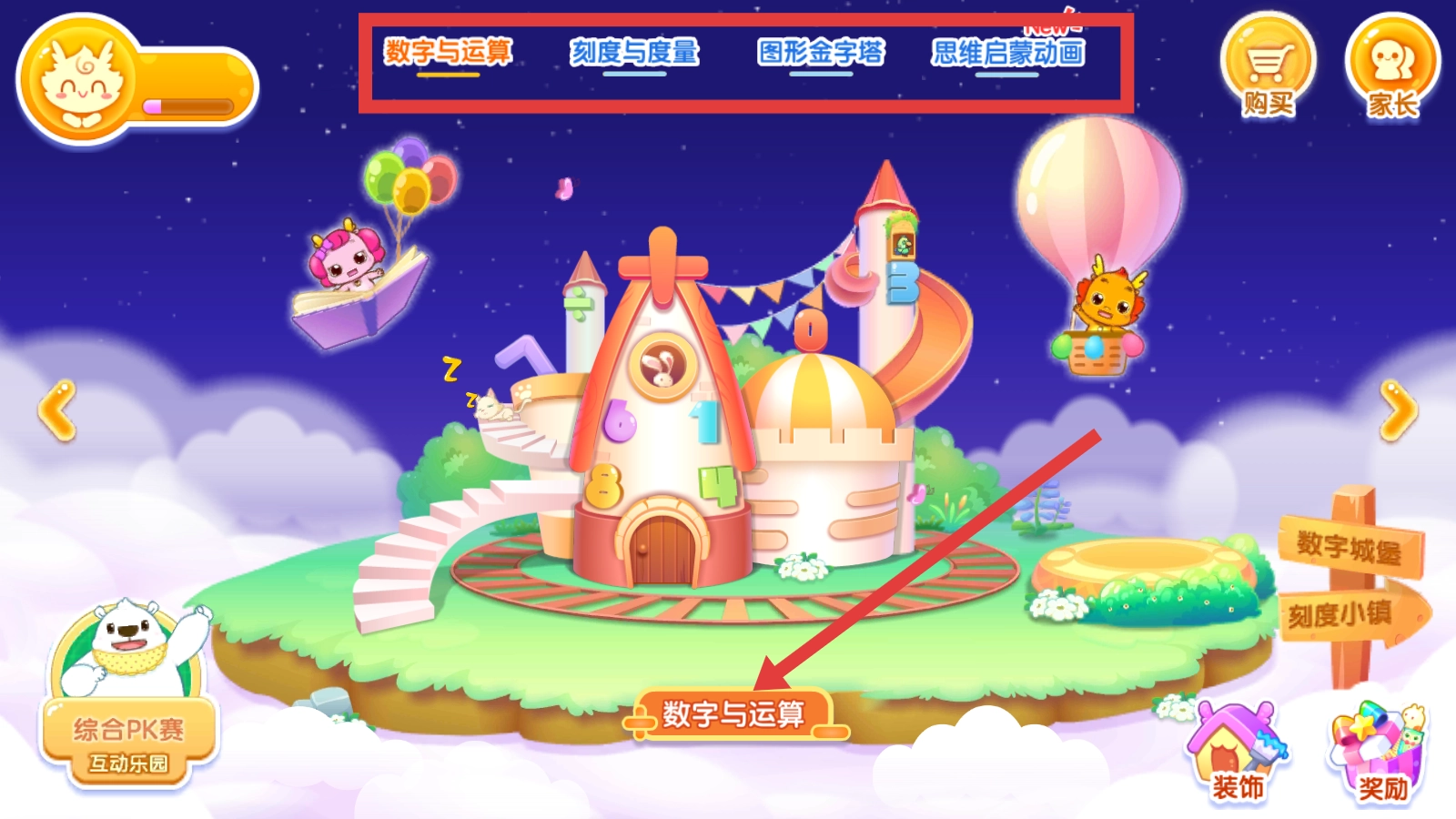 1、点击页面下方【数字与运算】按钮,进入对应学习板块。