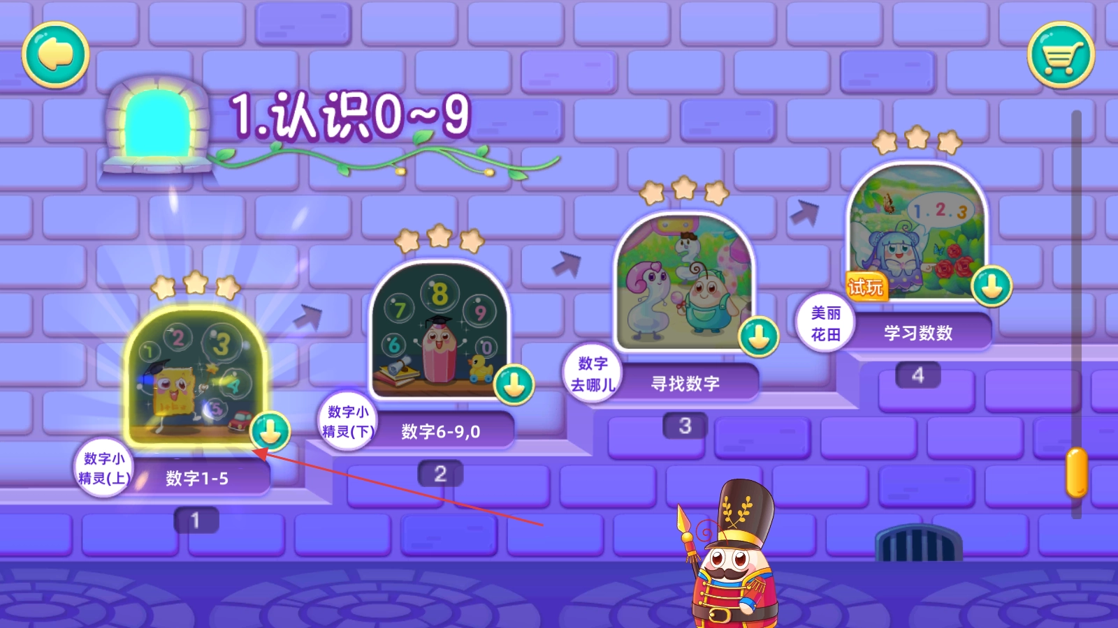 2、在【认识0~9】界面,点击【数字1-5】选项,开启数字学习。