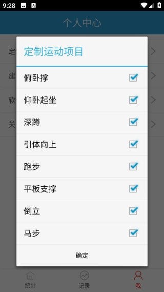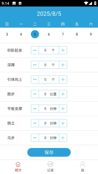 3、打开【统计】界面,记录并保存每日相关项目运动数据。