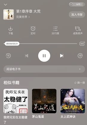 2. 在听书界面,可以对小说的章节、播放速度、定时等功能进行设置。