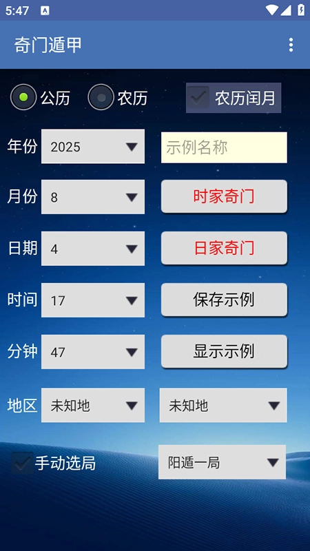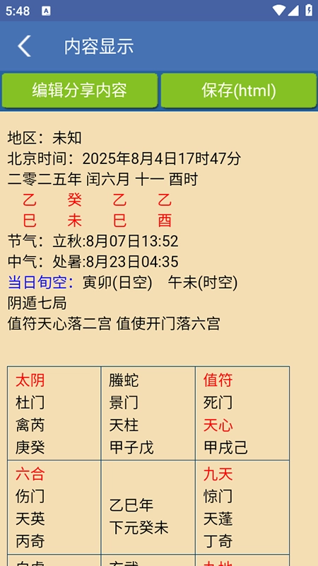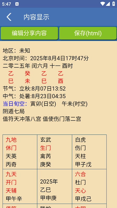 1. 奇门排盘:具备手动与自动排盘功能,依据用户所输入的时间(无论是公历还是农历)、地点等相关信息,能迅速生成奇门遁甲盘局。此盘局涵盖九星、八门、八神以及三奇六仪等要素的布局排列,完整还原传统排盘的逻辑。