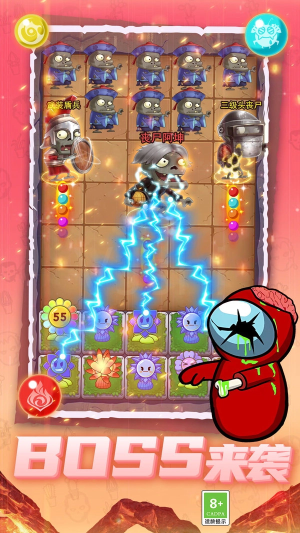 1.电击攻击BOSS:僵尸阿喵现身中路,被魔法植物连续雷电重创,全力抵御BOSS来袭。