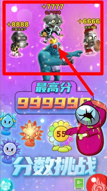 2.评分挑战模式:击败僵尸阿喵获得高分7777,搭配不同植物组合刷新超高纪录。