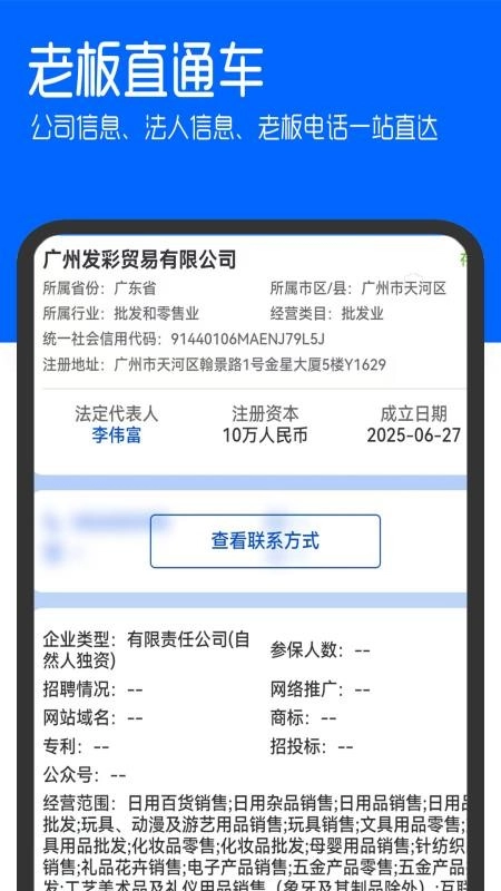 为用户提供了实用的老板直通车,能够对老板电话、法人信息来一键查询。