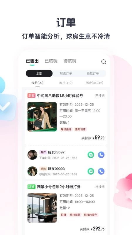可统一管理所有订单,知道各个订单的核销状态,同时可在线联系客服;