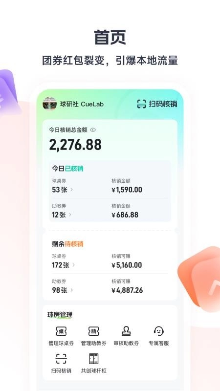 3、在首页可详情了解每日的经营数据,知道核销和收益情况,方便优化;