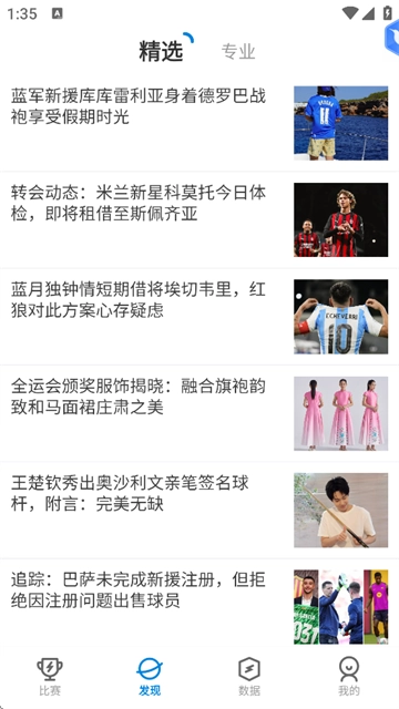 3、根据标题和配图选择感兴趣的赛事报道或球员专访内容。