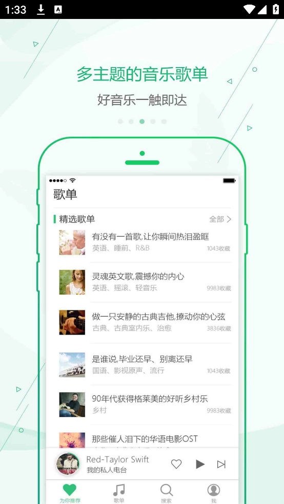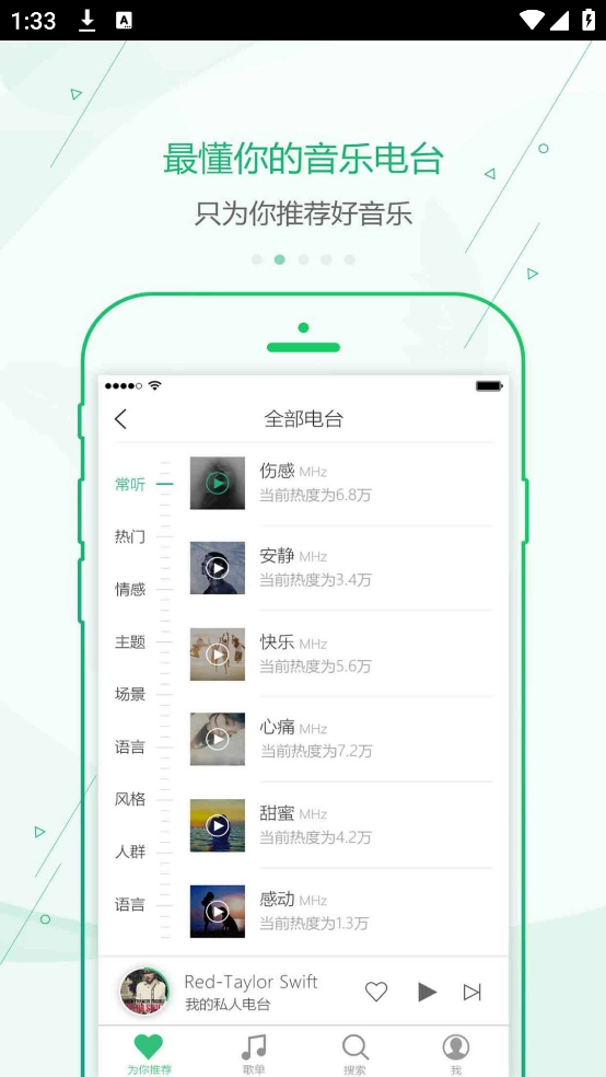 通过语种、曲风、情感、年代等多个维度来挑选电台,助你邂逅美妙音乐!