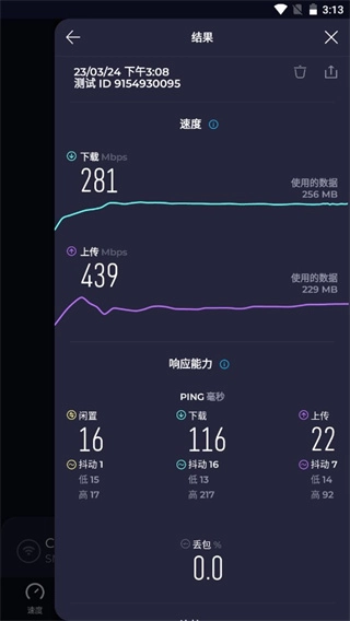 可进行5G网络网速测试,还能查看Ping值等详细内容及结果。