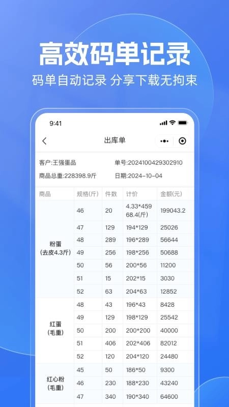 支持用户对商品的出库单详细记录下来,轻松记录码单数据,实时分享下载。