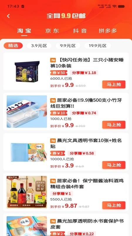不仅如此,天生主角免费版 APP 设有超多包邮特购专区,只要消费满九块九,就能享受免费包邮到家的服务。同时,在这款 APP 中,还能随时查看各大电商平台的优惠活动,各类热销榜单商品也能一览无余。