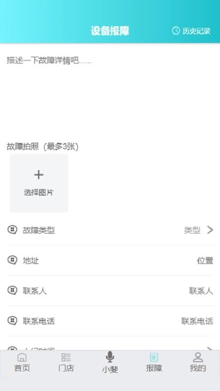 4、于设备报障页面,只需描述故障信息、上传故障图片、选择故障类型,就能完成提交。