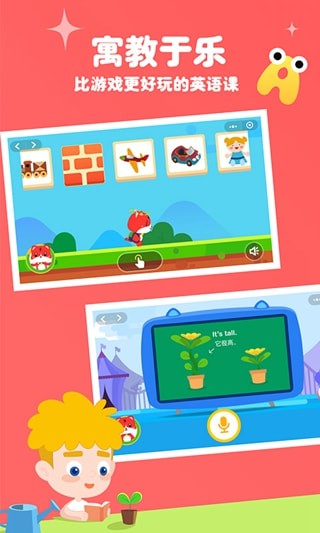 少儿英语课程打造围绕IP的趣味课堂,主要通过互动游戏与动画展开。宝宝仅需轻点屏幕、拖拽动画,就能学习到纯正的英语课程内容。