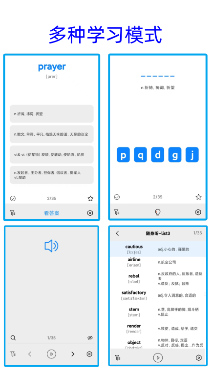 此外,还具备听写模式、测试模式、随身听模式以及拼词模式,能够满足多样化的学习需求。