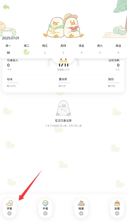 2. 进入每日饮食记录界面,选定相应餐次,接着点击“+”号新增按钮,即可开启食物录入。