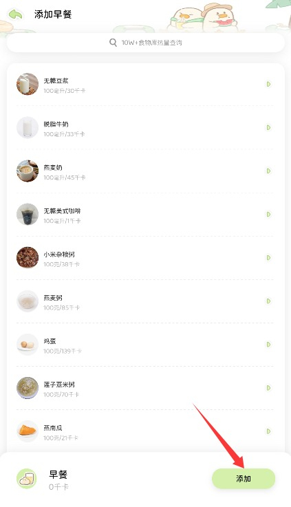 3、可通过搜索栏查找,也能直接挑选预设食物选项,确认之后便能成功添加到当日饮食记录当中。