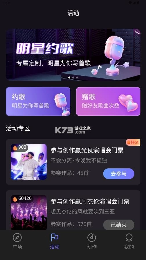 4. 点击下方“活动”按钮,就能加入边玩边赚的狂欢派对,参与活动有机会赢得丰厚奖励(详细步骤为:点击活动专区 - 选择赛事参与 - 投稿歌曲 - 赢奖)。