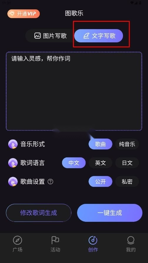 3. 点击“文字写歌”选项,在相应区域输入诗句或文案,接着利用AI谱曲功能一键生成歌曲。