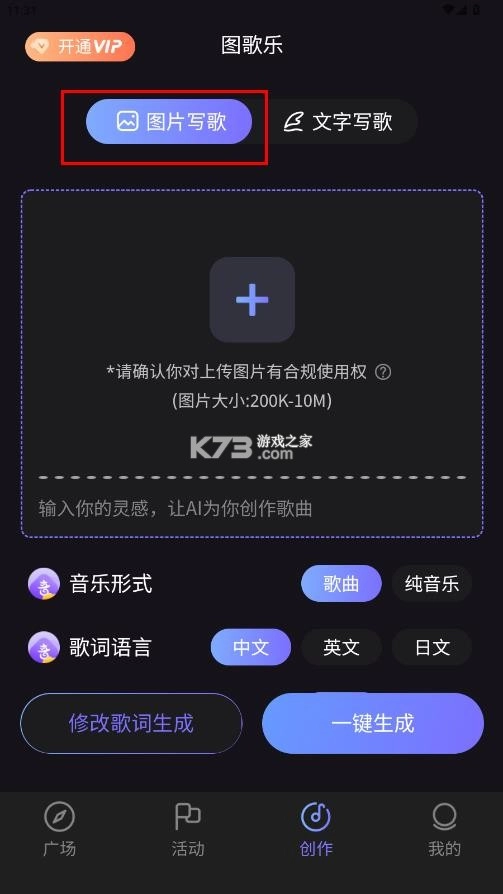 2. 轻点下方的“创作按钮”,即可进入音乐创作界面。在此界面中,选择通过图片来写歌,接着上传照片,最后点击智能解析,便可一键生成。