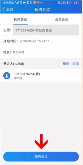 2. 接着点击“预约会议”,挑选开始时间,设定会议时长,在参会人列表位置点击“编辑”,添加参会人员,完成上述操作后,最后再次点击“预约会议”就可以了。而参会人员只需点击“加入会议”,输入会议号便能加入会议。