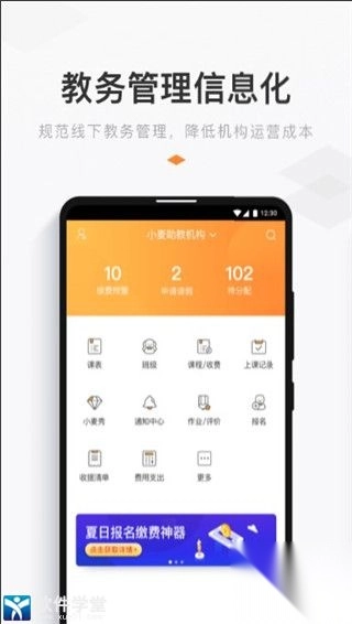 教务管理1、智能排课:支持多种复杂的排课形式,如单双周、跳周等。2、学员考勤:上课通知1对1提醒,支持人脸识别、刷卡签到、点名考勤等多种途径。3、教师管理:课时课消自动统计,排课更省时,办公移动化。软件亮点