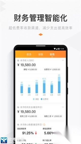 财务管理1、学员报名:学员扫码自助缴费,支持多种收款设备。2、退课转课:退课转课联动操作,收费差价流水清晰。3、教师薪资:线上搭建薪资体系,支持阶梯式核算。4、经营分析:了解校区经营情况,培训学校管家。软件功能