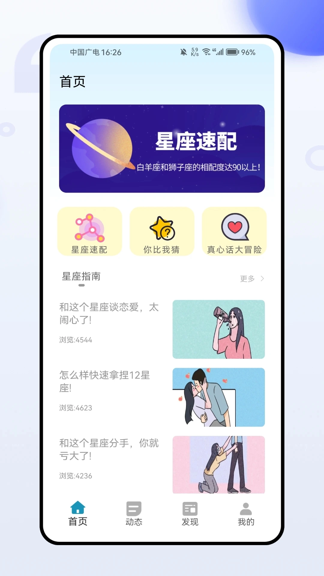 1、在首页,你能够知晓星座速配、你比我猜以及真心知大冒险等方面的知识。