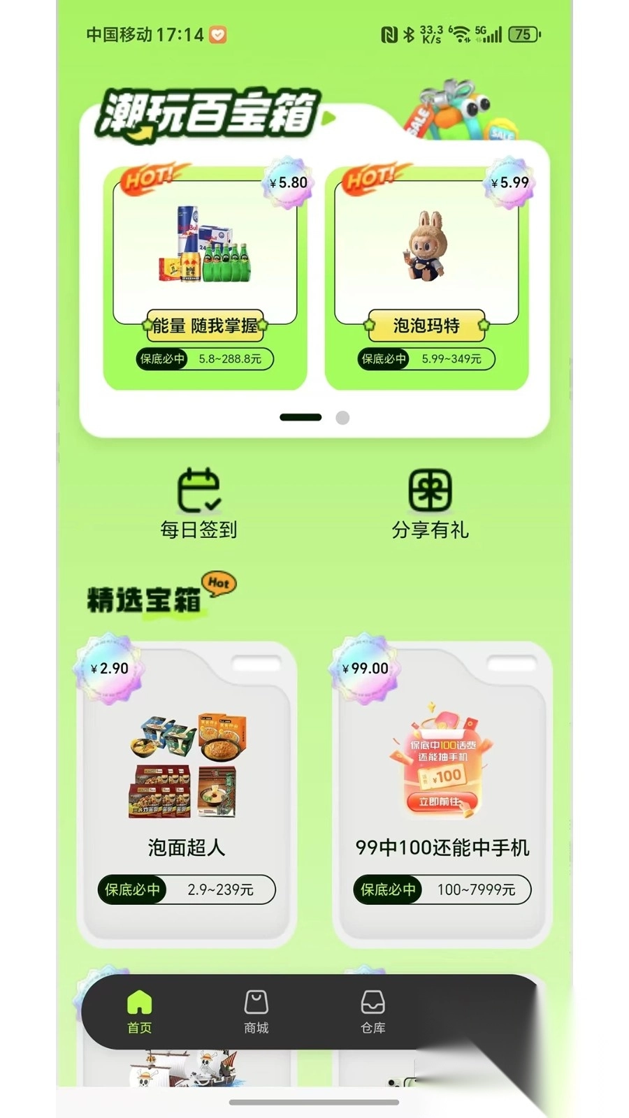 1、首页上有不少很棒的潮盒,你能随时在线挑选心仪的盲盒。
