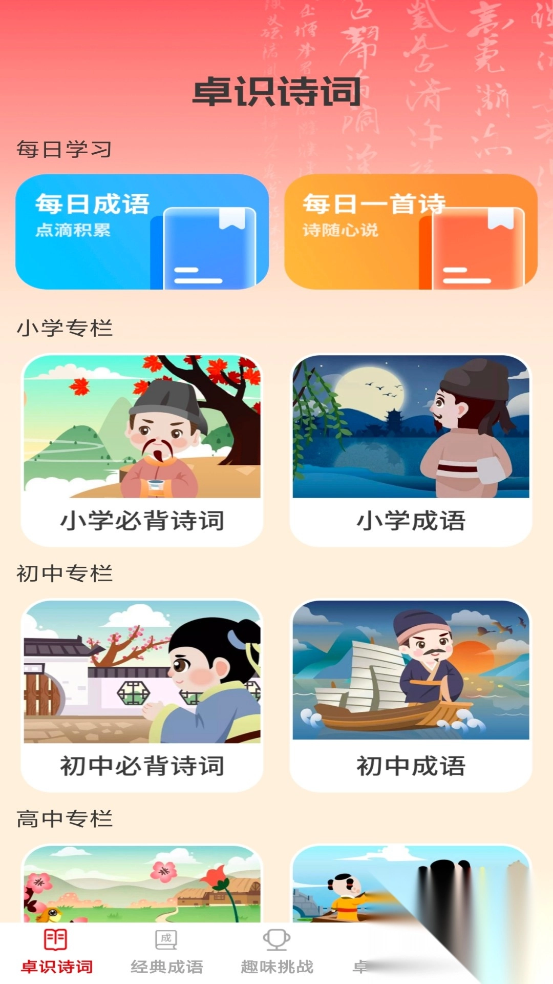 1. 具备每日成语学习、经典成语学习以及诗词学习等功能,知识内容覆盖不同阶段与历史时期。