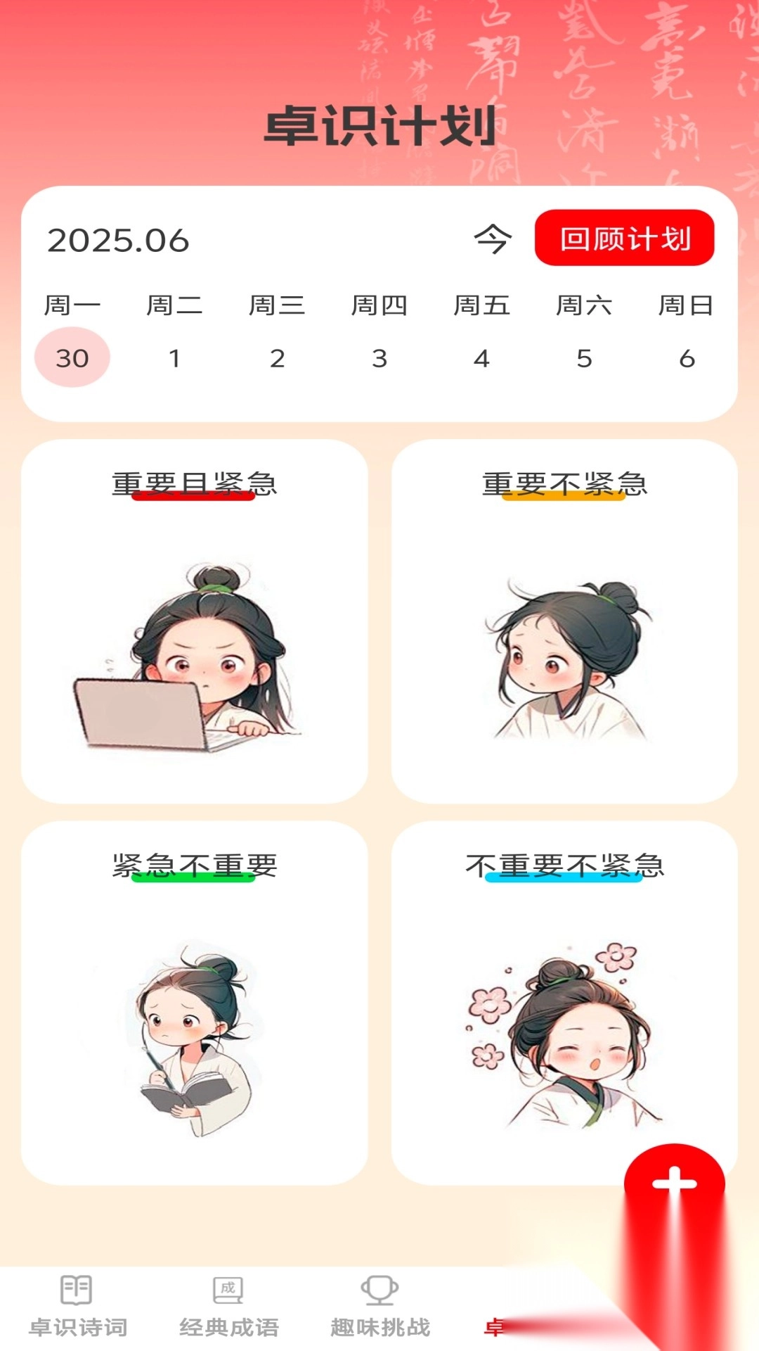 3、支持制定卓识计划,自定义学习任务并进行管理,同时提供诗词分类查询功能。