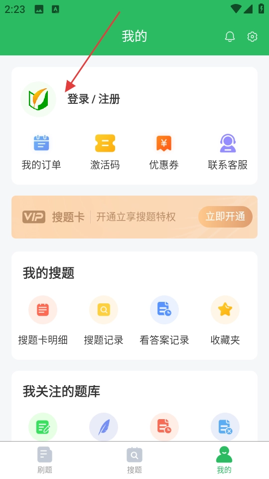 1. 于刷题页面点击底部的“我的”选项,即可进入个人页面。