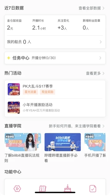 重点突出主播收益数据,同时兼顾热门活动、直播学院等内容。