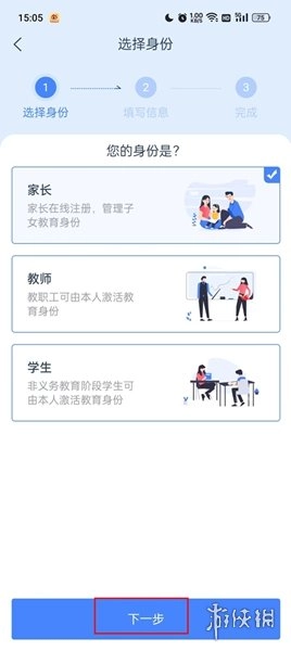3、于注册页面,挑选您的身份并予以勾选,随后点击【下一步】。