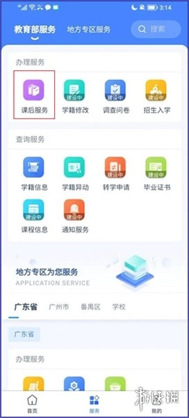1. 开启学有优教,完成登录操作后,在页面底部的导航栏处,切换到【服务】栏目。接着在【办理服务】里,点击【课后服务】,从而进入相应页面。