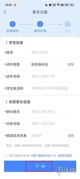 4、于填写信息页面,精准录入诸如【学生激活码】这类重要信息,并勾选相关协议。在确认信息准确无误后,点击【下一步】以完成注册。
