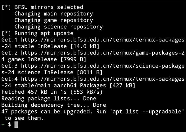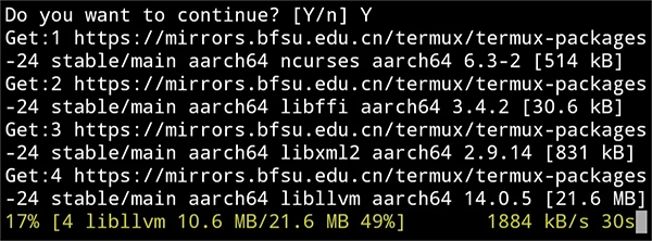 注:以下操作仅适用于较新版本的Termux,例如0.114版本,0.73版并不适用。(警告:该镜像仅适用于Android 7.0(API 24)及以上版本,旧版本系统使用此镜像可能引发程序错误。)