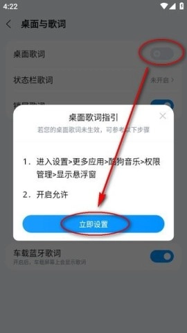 4、开启“桌面歌词”后的按钮,系统会引导你完成设置,点击“立即设置”就行。