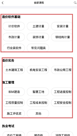 2、打开课程,其中包含造价软件基础、造价实务、施工管理、职业考试等课程类别,此外还有精彩的直播课程以及免费课程。
