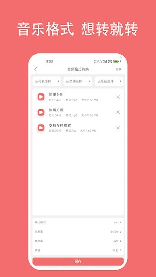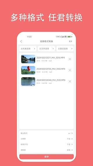 1、丰富的格式转换功能:不仅支持MP4、3GP、AVI、MOV等常见视频格式之间相互转换,而且支持MP3、AAC、WAV等音频格式的相互转换,同时还能够对分辨率、帧率、采样率、比特率等设置进行切换。
