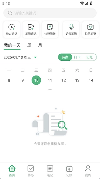 1. 首页的上方设置了各类功能的快捷入口,而中间区域则可依据日期与类别对内容进行筛选。